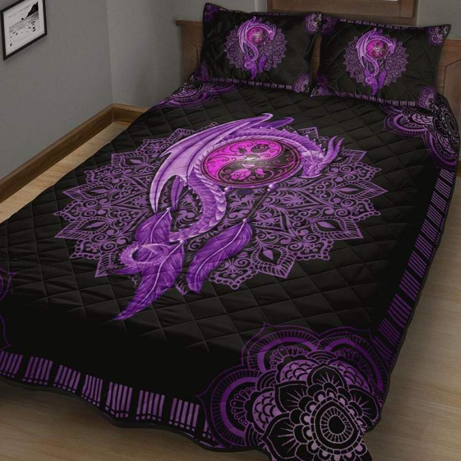Dragon Ying Yang Purple Mandala Quilt Bed Set
