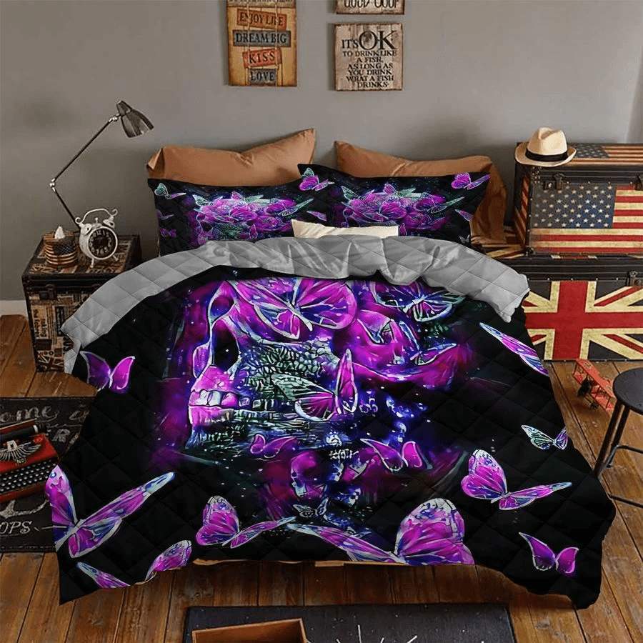 Skull Purple Butterflies Quilt Bed Set #DH